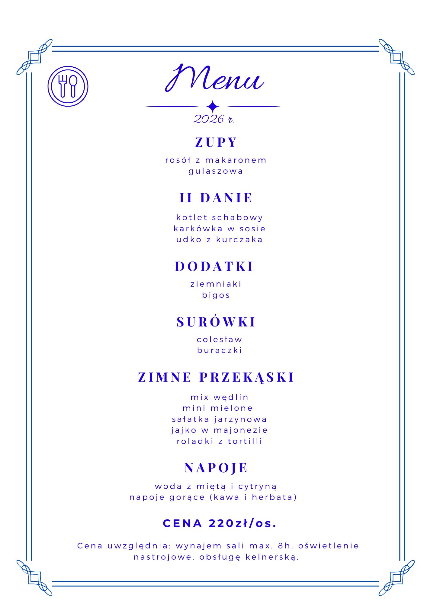 menu do uzgodnienia. Szacowany koszt od 290zł brutto/os. (cena nie obejmuje noclegu, alkoholu, tortu i dekoracji sali – są to opcje dodatkowe).